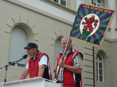 Camarades ! Il y a 454 ans, dans une admirable union, nos ancêtres livraient un combat acharné contre le fier Charles le Téméraire de Bourgogne. Le coup décisif qui menaçait notre patrie fut brillamment repoussé à Morat, sous la devise : « Un pour tous, tous pour un ».